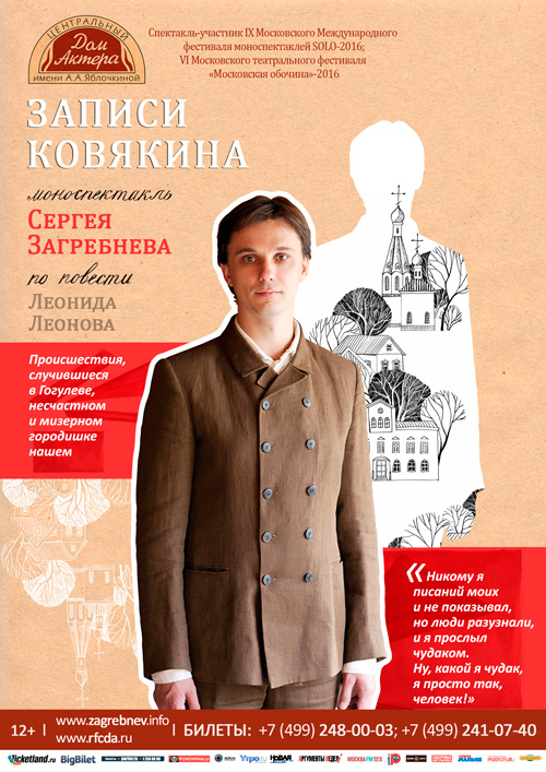 Моноспектакль поставлен по повести классика советской литературы Леонида Леонова, — писателя, обладавшего самобытным языком, тонкой иронией, даром интуитивного предвидения. «Записи Ковякина» не только являются ярким свидетельством событий начала ХХ века, но и обнаруживают поразительно точные совпадения этой трагической эпохи с сегодняшним днём. Герой спектакля рассказывает о маленьком «заштатном» городке и его жителях, проявляя удивительную, по-детски светлую восторженность и открытость миру. Он ощущает себя летописцем, сохраняющим для потомков память о «важных эпизодах» и «значительных происшествиях»; и кажется, что ни один «удар судьбы» не сможет сломить Ковякина, лишить его всеобъемлющей любви к жизни, к людям, к родному городу.
